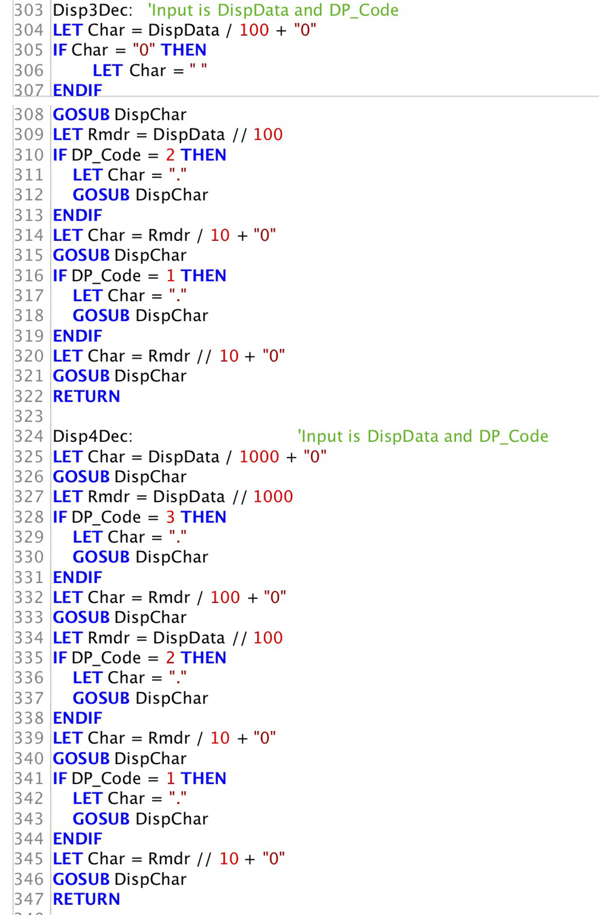 Picaxe has a command for this but I chose not to use it because: 1. It needs a lot of variables. 2. It is slow 3. It does not directly handle decimal points. I could combine the two, but why bother? The code explicitly does not change the input "DispData". |