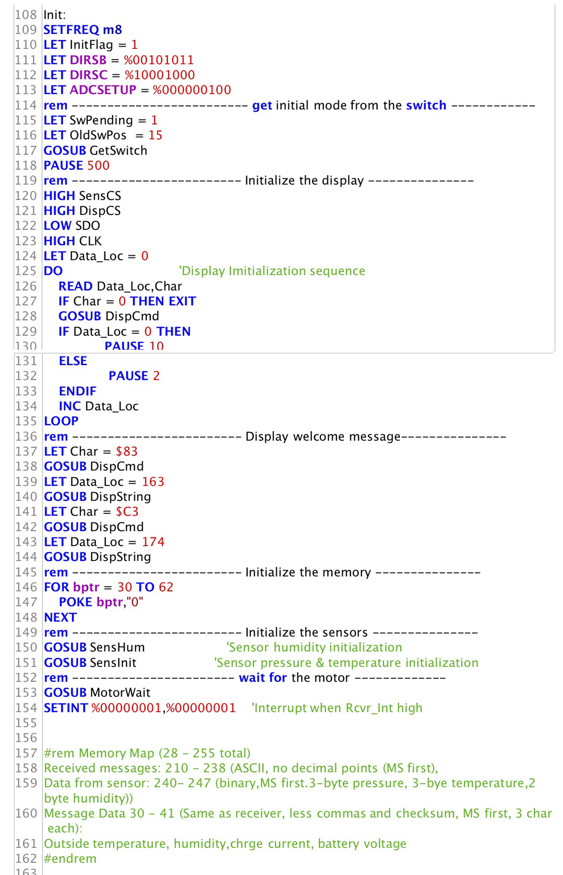 This is the initialization code. It includes: 1. Initializing the display 2. Making sure the variables are preset. 3. Presetting the Mode from the manual switch. 4. Displaying a "welcome" message while the dial is re-indexing. 5. Initializing the internal sensor. 6. Initializating the external values memory. (It may take up to a minute before the first message is received.) |
