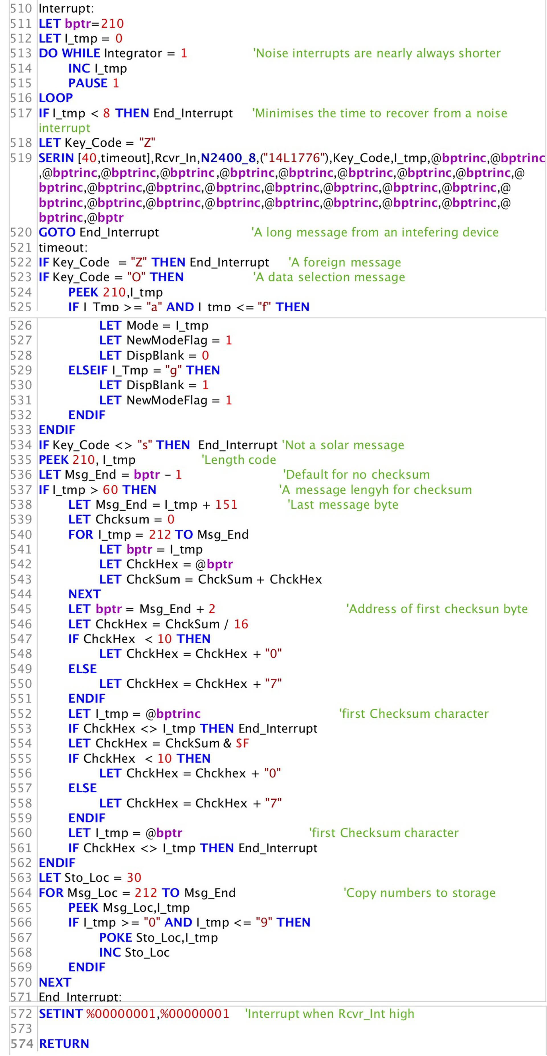 This is the interrupt code. It is invoked when a message arrves from the receiver which is preceded by a 20ms pulse to activate the interrupt. Since this may be from any RF transmitter, multiple tests are made: In order to give time for the SERIN command to start, approved messages start with a wide pulse. The width of this is measured and messages not in an approved range are rejected. Approved messages start with a alpha-numeric character less than "z". Others are not used. There are two accepted messages, as determined by the first character after the SERIN unlock code:"14L1776".: 1. "O' messages are commands to change "Mode". This also sets the "NewModeFlag" to refresh the display quite soon after the end of interrupt. 2. "s" messages are weather reports, once a minute. These are verified by a 2-hexadecimal checksum at the end. The actual ASCII values are extracted and copied to memory per the table in EEPROM. |