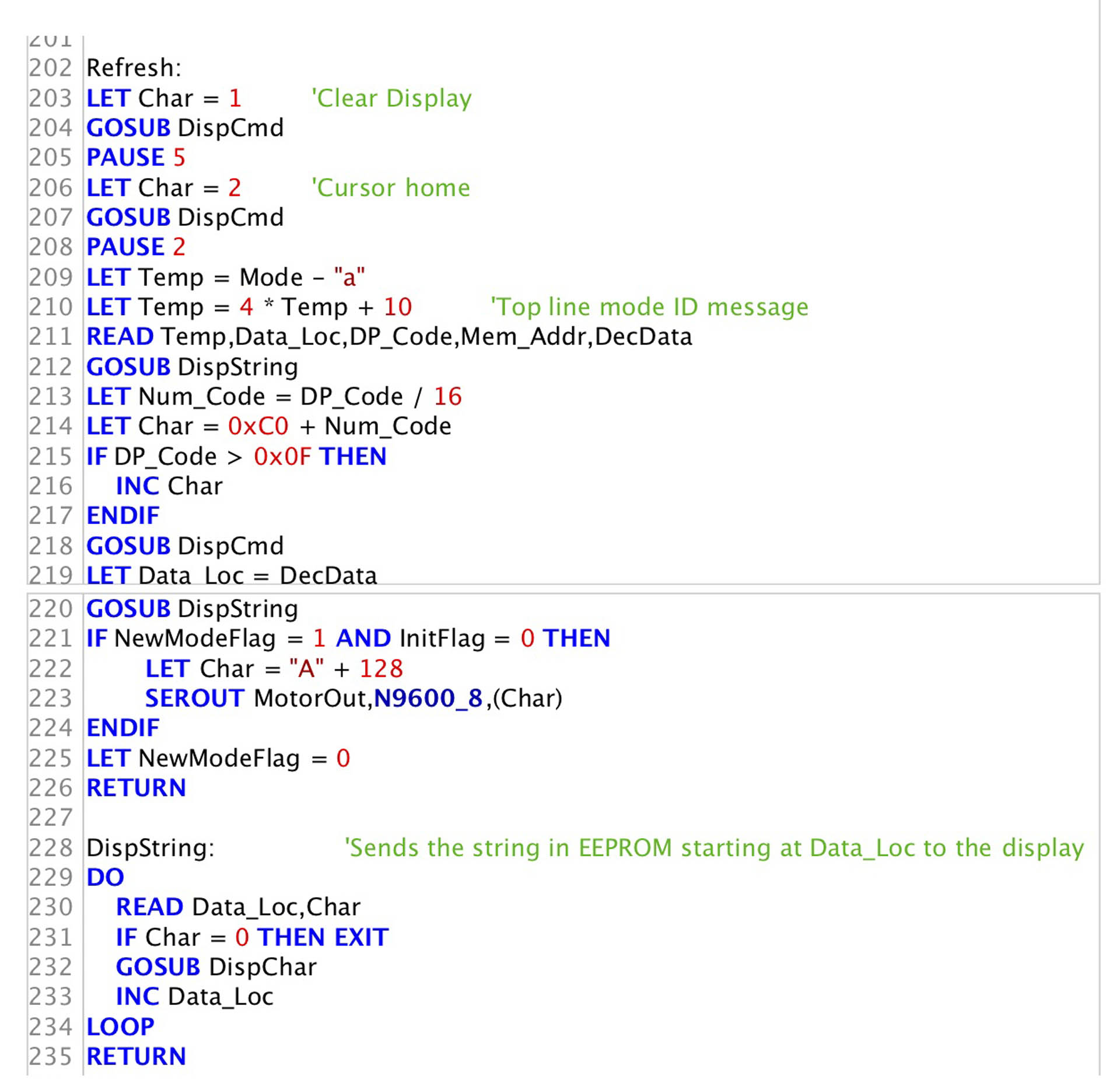 Refresh is called only when Mode changes, or after an advertising message. It prepares the display by clearing it, then writing those characters which do not change with Update. It gets its information from the table in EEPROM, which is indexed by Mode. It is aided by DispString. It also re-indexes the dial. |