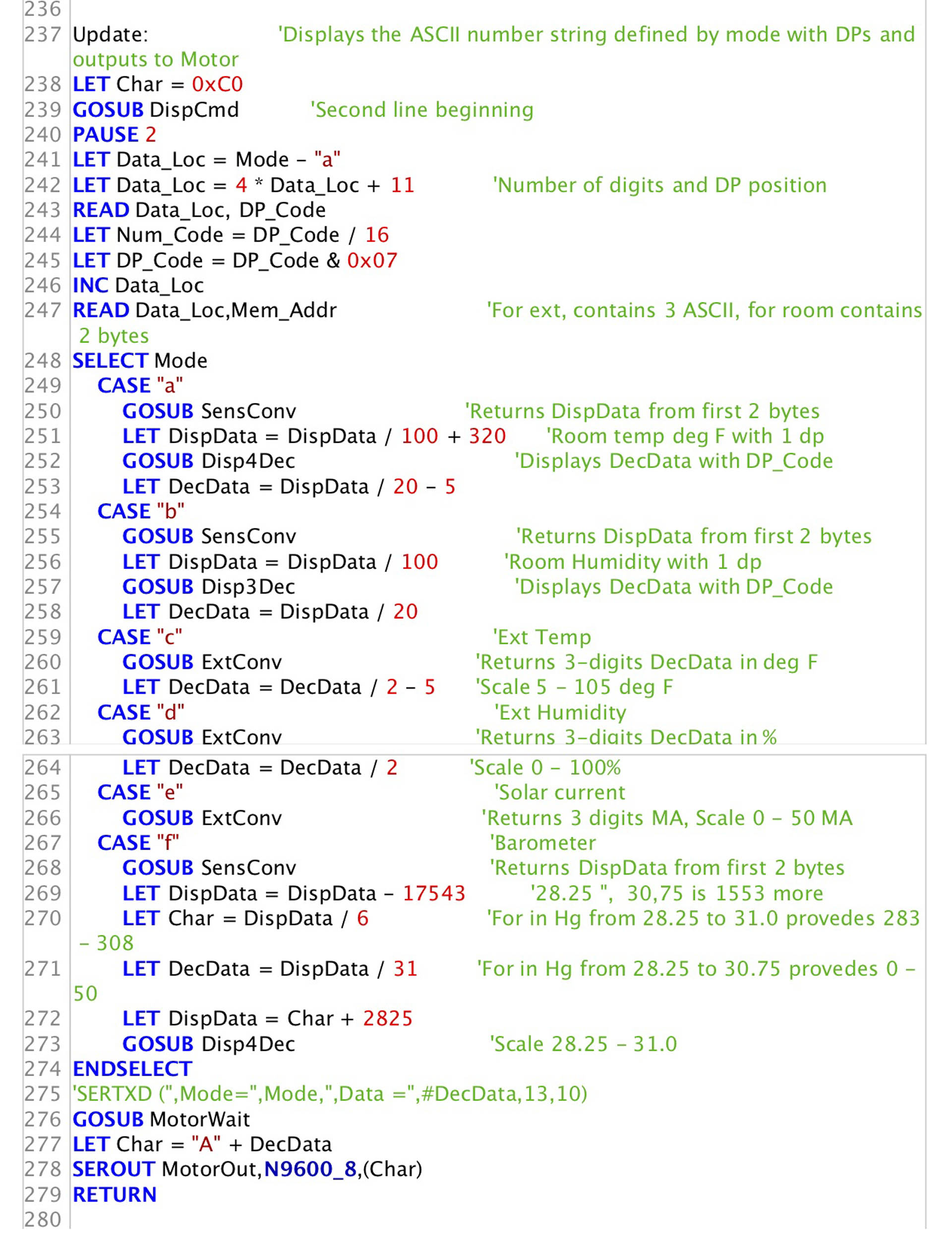 This periodically updates the numerical measurement at the beginning of the second line. All scaling calculations are in this code section. It also sends a command to the dial, which may not necessarily be proportional to the displayed number. It gets its input by reading the table in EEPROM which is indexed by Mode. The data is retrieved from memory, but internal and external are treated different. The internal measurements are 2 binary bytes, which must be combined into a word using SensConv. This needs to be processed differently for each Mode because of scaling.. The external measurements are already in ASCII and are displayed by calling ExtConv. but Update gets a binary byte which may be custon processed for the dial command. The dial output is converted to ASCII and transmitted to the Motor Picaxe when it is ready. |