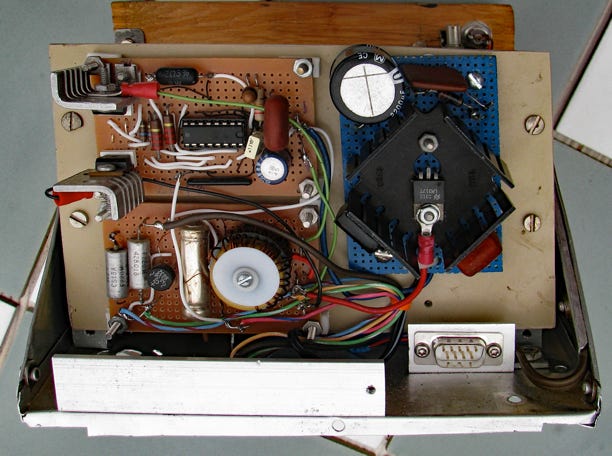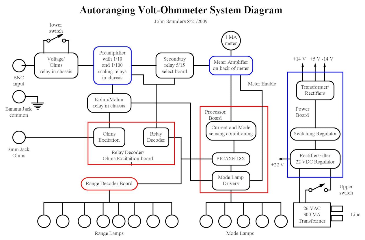A 70s-era Volt-Ohmmeter was refurbished using a PICAXE instead of RTL logic.This shows the finished V-O-M. It was worth the effort in order to re-cycle the excellent meter and the military-quality indicators. The solid oak box is new, as the old one was much the worse for wear. Besides, the nice box adds a psychological justification for the effort.