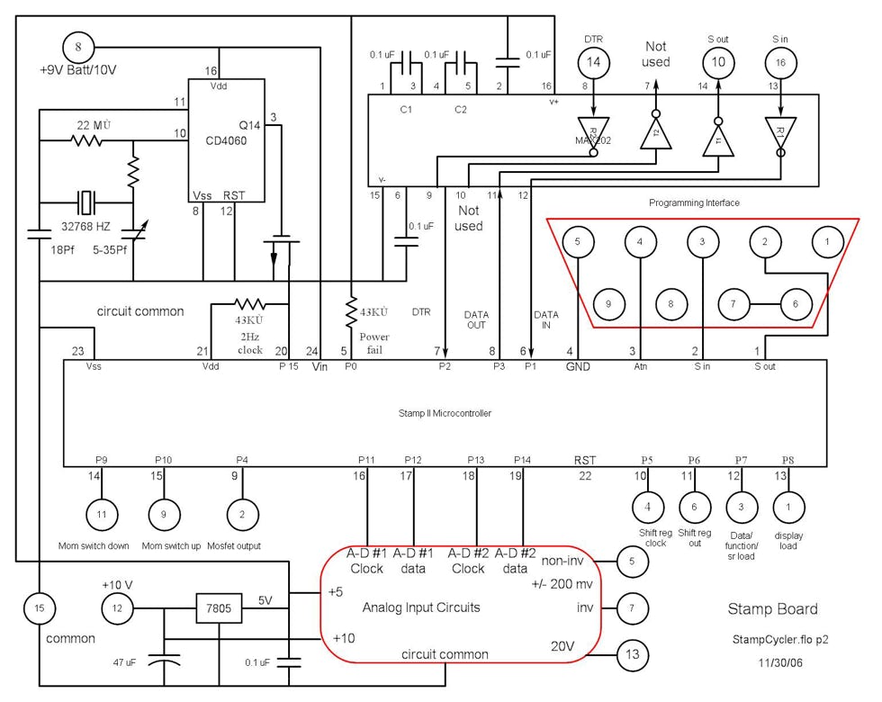 This shows the physical components of the system. All elements are interconnected via a large hinged board.The microcontroller is on a Parallax development board which also has the digital watch circuit and a MAX 202 RS-232 transceiver with two outputs and two inputs. Connections are via a 16-pin DIP socket and snaps for a 9-volt battery. It is mounted on the back on the right with the D-9 S programming port recessed.
