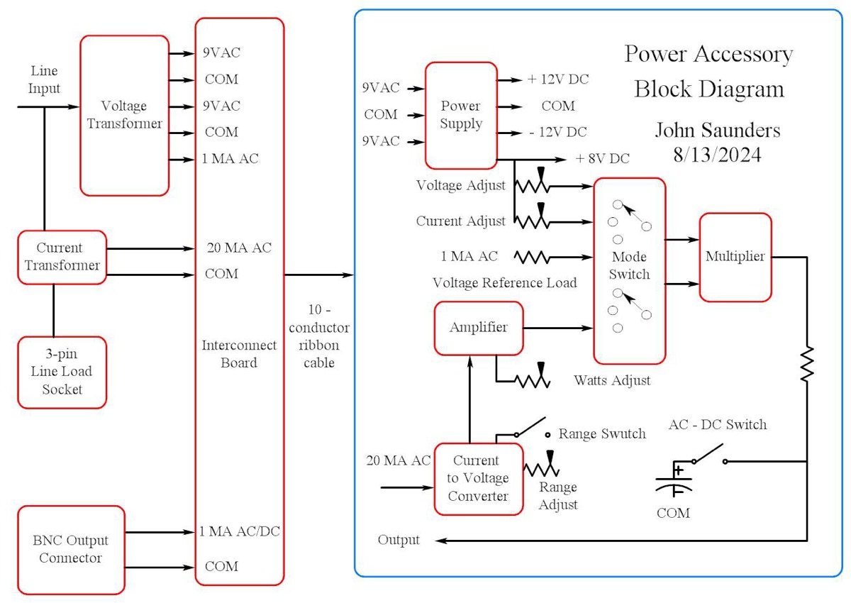 Since the AD633 also accepts DC inputs it can also act as a variable amplifier. This is used to measure line voltage and test load current. All 3 output modes have the same 1 MA full-scale calibration.