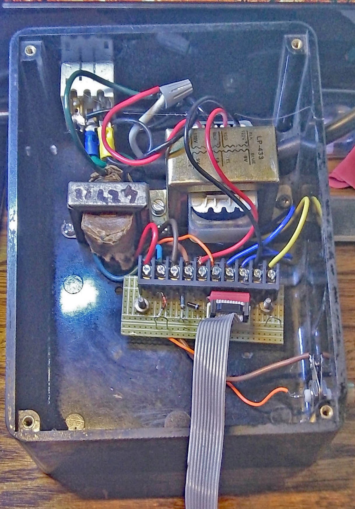 The two transformers are bolted to to base of the enclosure, as is an interconnect board for the shrouded IDC 10-pin header which connects to the active components. The larger transformer has two secondary windings. One is for power, the other is for the voltage reference. This has a dropping resistance.