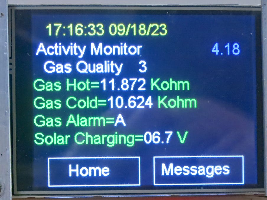The Activity display is selected from the Main page. Its navigation buttons go back there or to the Messages page. It also always shows its header the time, date and battery voltage. The battery voltage display changes color with range: Blue, Green. Red. On red, turn off or plug in a charger! Each also shows the minutes since the previous receipt.