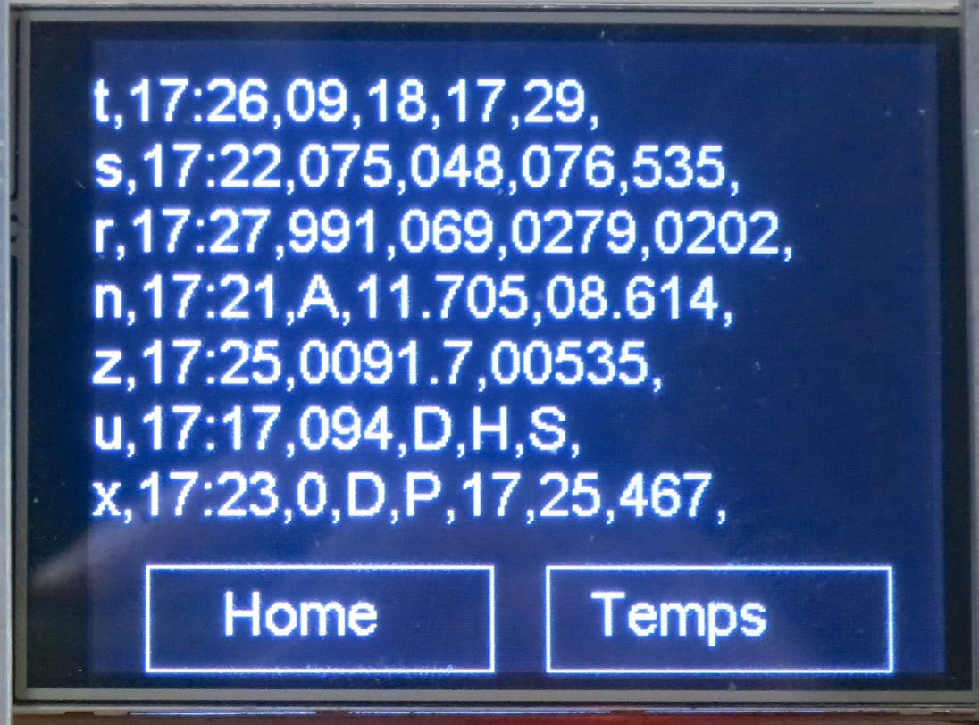 ‘r’ is also from the sensor box. The first is pressure needing either a 29 or a 30 in front. The second is the output voltage of the array. If less than 7, the internal battery is charging, else it is the external battery being charged. The third is the accumulated milliamp-hours today, the last is yesterday’s MAH. It is transmitted every 72 seconds.