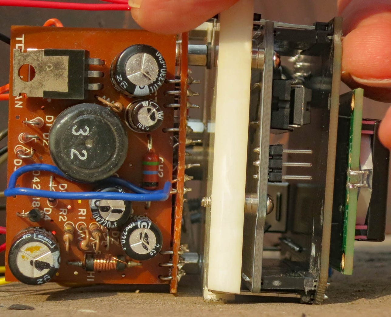 The display uses 4-bit parallel. The 2 transistors correct for the inverted serial output of the Arduino and for its inability to form a pulse. The Chinese Arduino clone failed and was replaced by a genuine Italian one.