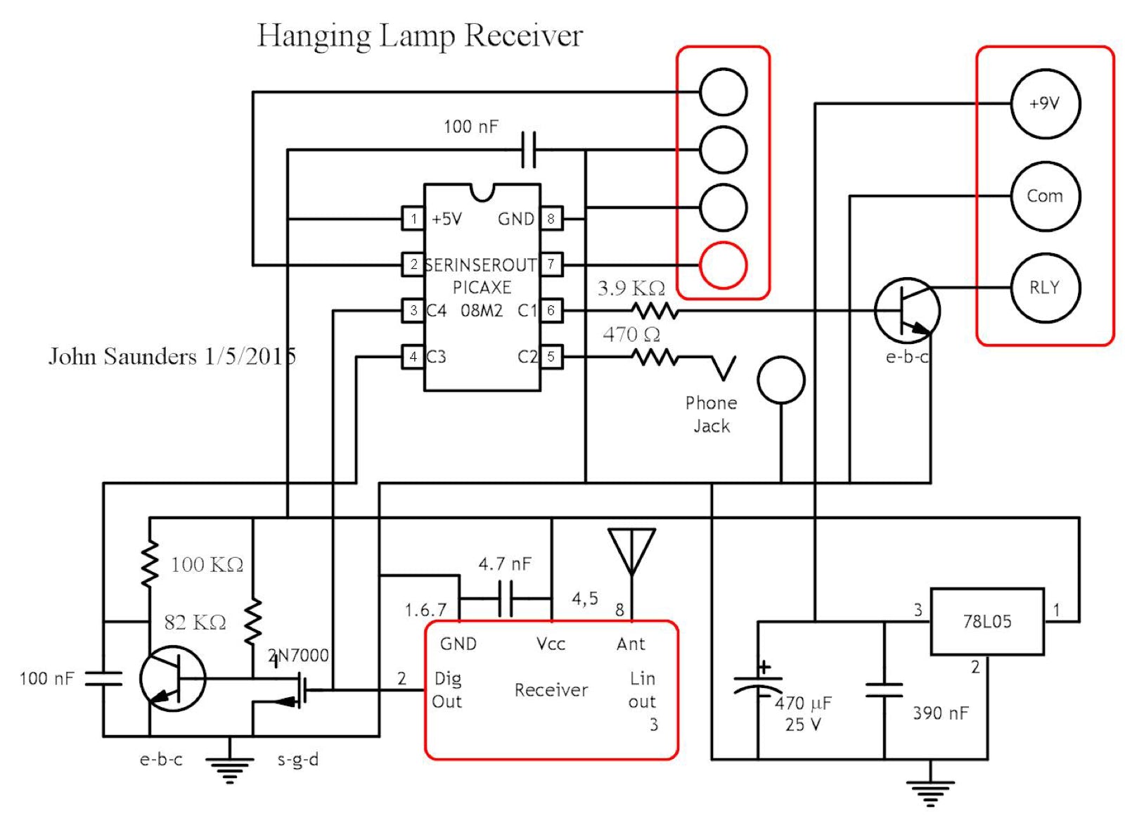 This receiver was originally used in conjunction with a box which provided a constant current to illuminate ornaments. The box was controlled by a cable plugged into phone jack. This setup became obsolete; see the Display Cabinet Receiver.