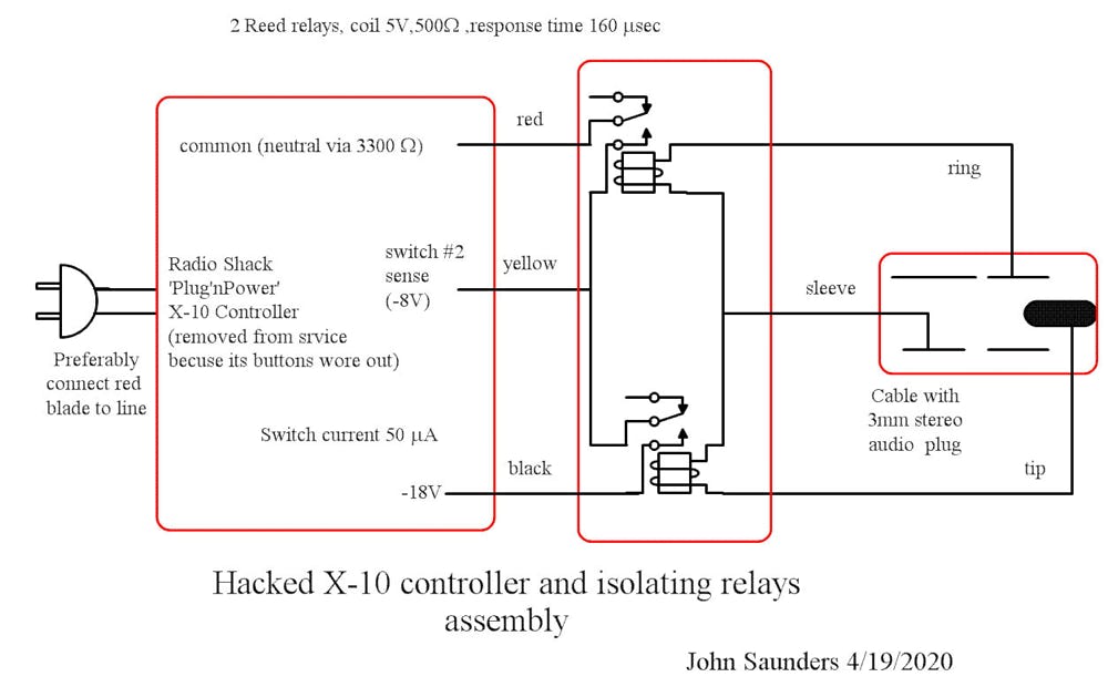 The X-10 keypad keys are not isolated from line voltage so the relays are needed to provide galvanic isolation. They are reed relays, connected across two keys using fine wires,