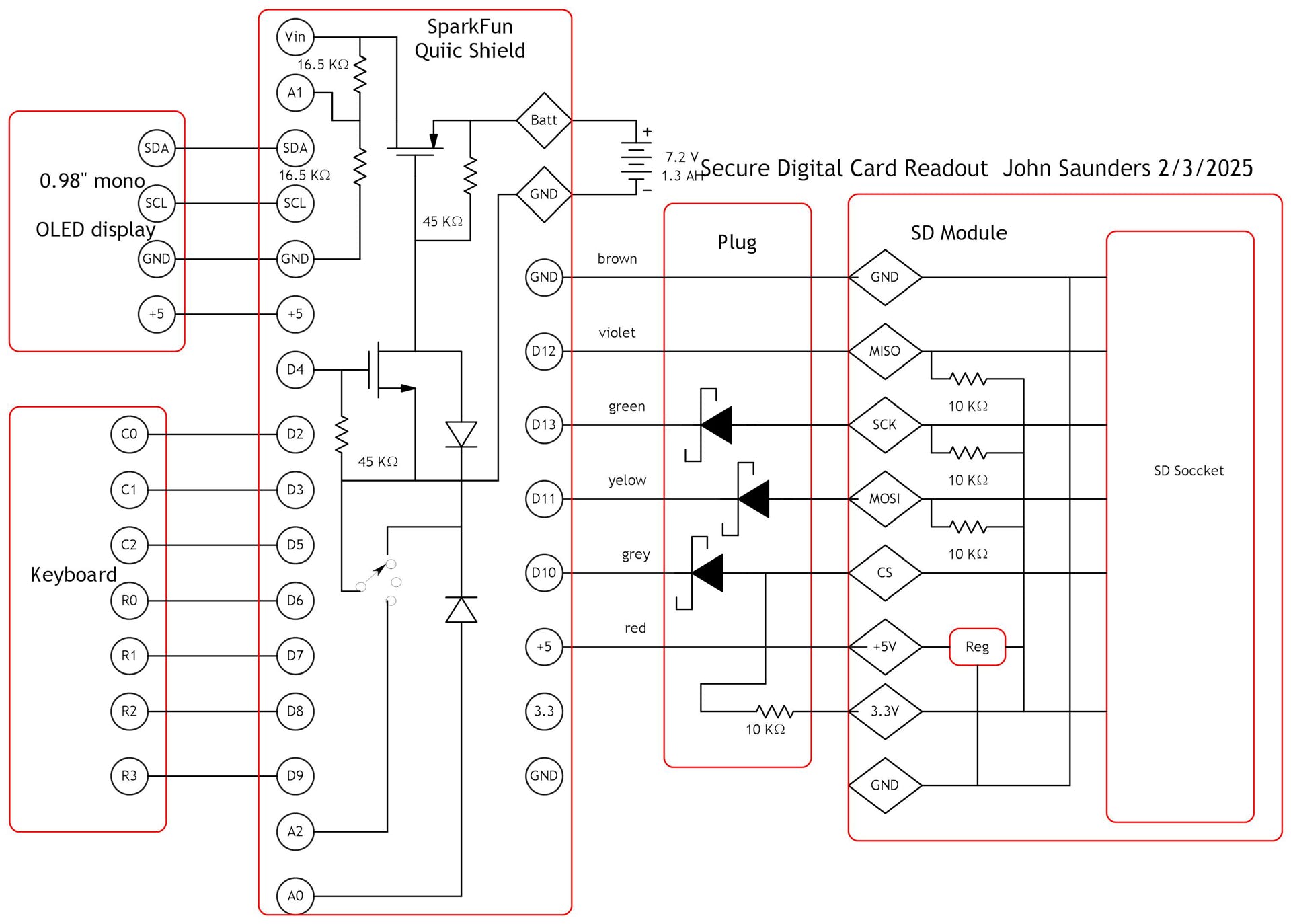 The Chinese SD module was really cheap, but its design is screwed up and does not protect the SD card from the 5V Arduino. Hence the diodes on the SD inputs. The pull-ups are useful but the fourth (not shown) was not connected to the SS pin, so I had to add one,