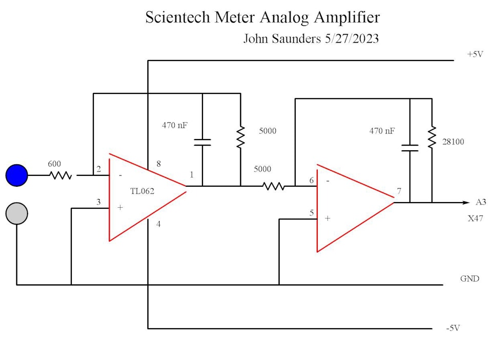The Back Amplifier is constructed on the processor Board. It was designed to match the resistance of the analog meter it replaces. Since that meter needed only 80 mv, emphasis was on low input offset voltage, as well as input bias current much less than 100 uA. This resulted in selecting a J-FET op-amp.