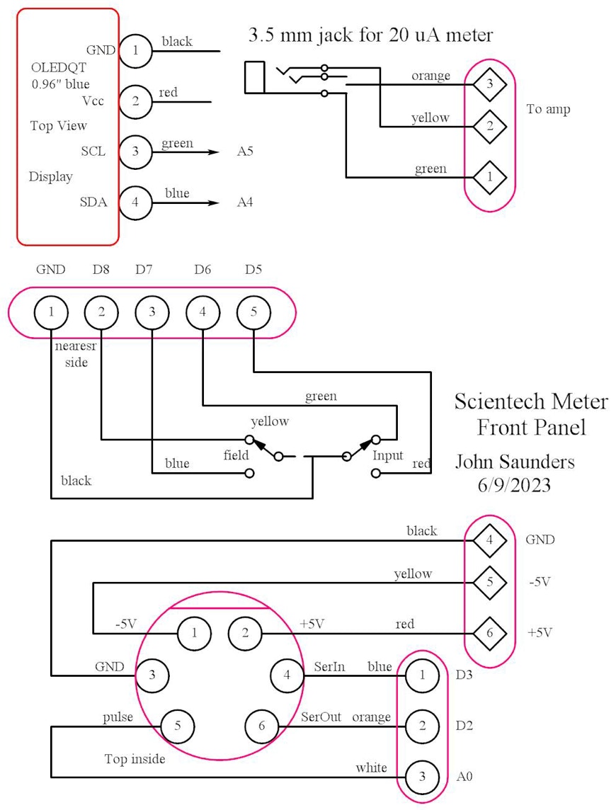 These are all fastened to the narrow vertical strip on the right of the neopixel arc. The switches and the jack for the external meter use little boards to hold headers, so their cables have connectors on both ends.