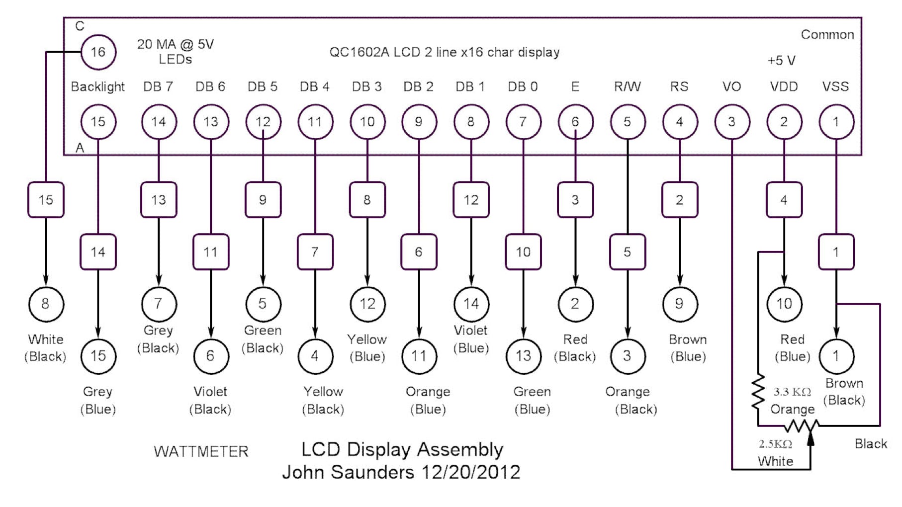 The display is of the common HD44780 type. It can use a 15-pin connector because its contrast pot is directly wired to it. The connector and ribbon cable are recycled from an old PC game port.