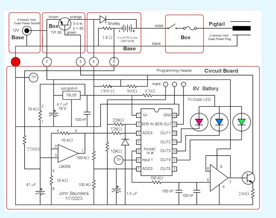 A resistor divider measures the battery voltage, plus the blocking diode drop, about 0.3 V. A three-color LED gives an indication of the battery state when charging. It is visible through a hole in the cover.