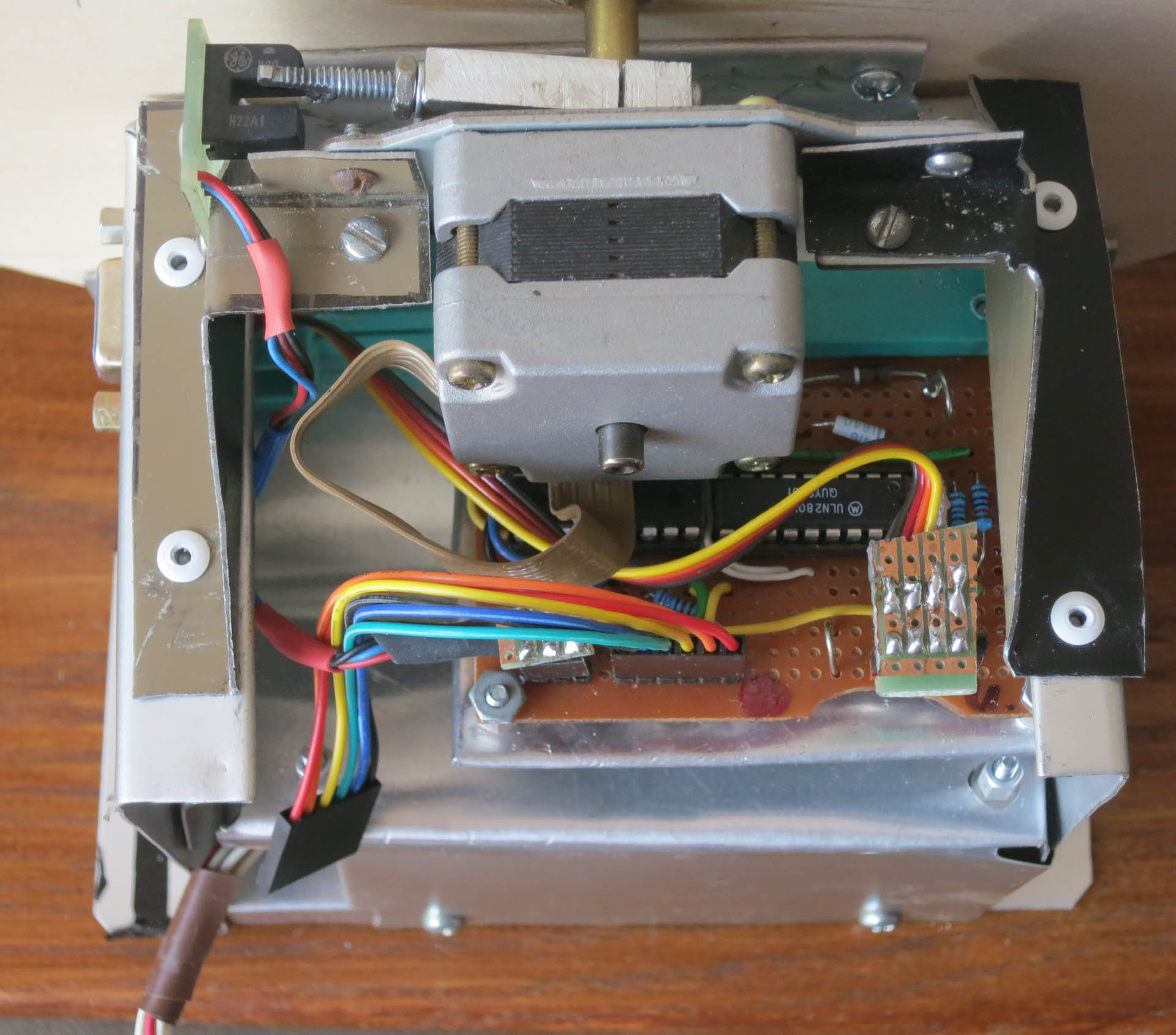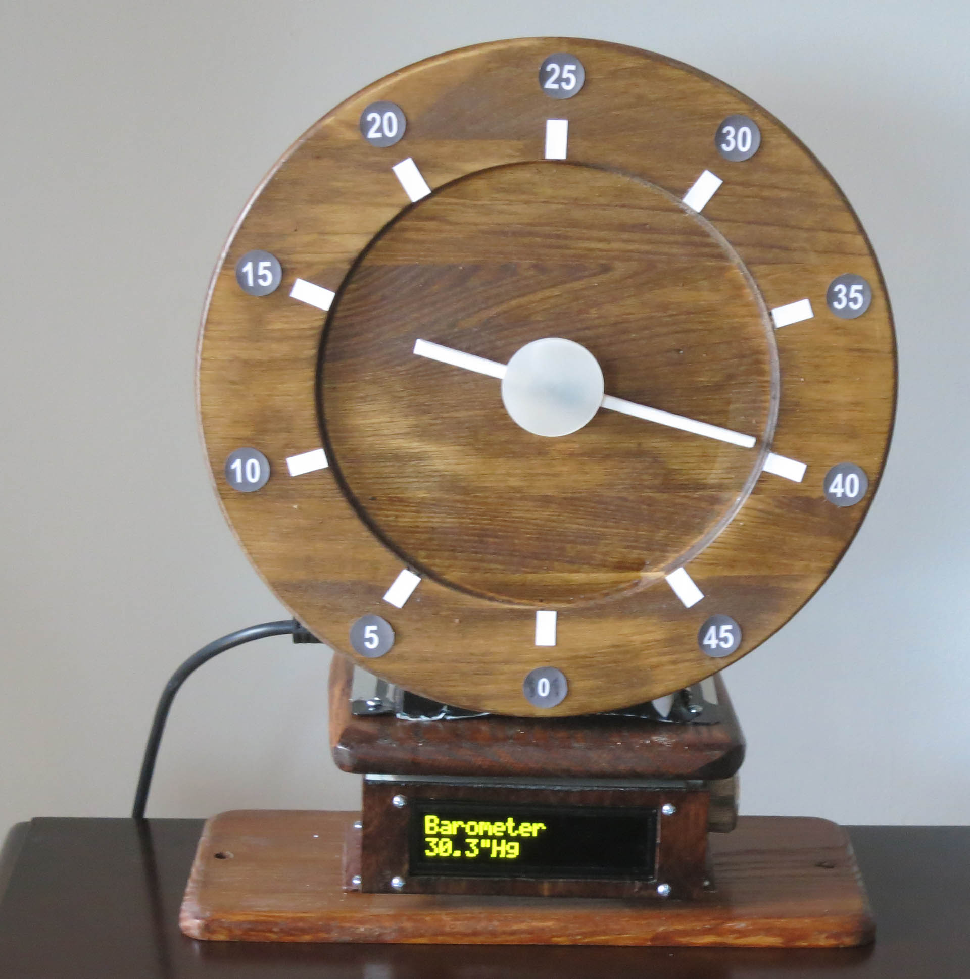 This replaces a Stepping Motor Clock because I used its chassis for this project. In any case it was removed from the index because it never worked reliably. The analog readout is driven by a 50-position stepping motor and a 12 inch dial, while the digital readout is a 2x16 OLED display. It has six selectable inputs. Three are provided by its own digital sensor, while the other three are received from messages sent each minute from the Solar Transmitter project (in the RF Data Communications section). There are two ways to select which input to display, local and remote. The local methed is a rotary switch, and the remote is by using the Handheld Universal Control with OLED display (in the RF lighting Control section). Both are always active, the last selection made is used. There are two circuit boards with Picaxe controllers: 1. The Motor Controller which provides the pulses for the stepping motor. It gets its input by a RS-232 TTL-level character from the Sensor Board. It sends back a "Ready" signal when the motor is stopped. 2. The Sensor Board, mounts under the Stepper Motor Controller, to which it is connected by a 6 conductor cable. It contains a temperature-humidity-pressure digital sensor, and a receiver. It connects to the digital display via a 10-conductor cable. Also there are chassis Components These inlude the Digital Display, the Power Supply, and the Selector Switch.. |