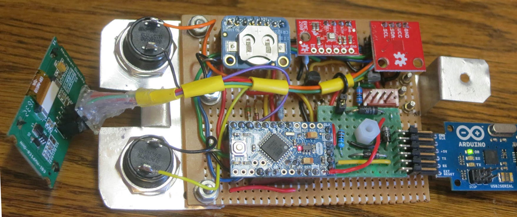 This assembly is mounted upside-down. All sub-assemblies plug into the mainboard.<br>The mainboard is secured by the push-buttons and a screw into a block glued to the box.<br>The OLED display on the left is mounted into slots in the box. <br>The blue board on the right is a USB to RS-232 adapter. It is not included when the project is in use. <br>The green board is a 5V to 3.3V level shifter. It is fastened to the Arduino. The USB adapter is 5V but everything else is 3.3V.<br>The 4-pin header connects to a pigtail from the power assembly.