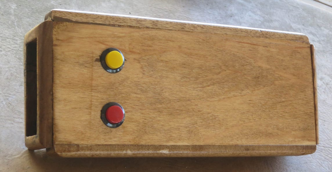 This box is made mostly of maple. Removing two screws holding the rear bulkhead allows the bottom to slide out for battery replacement or programming.