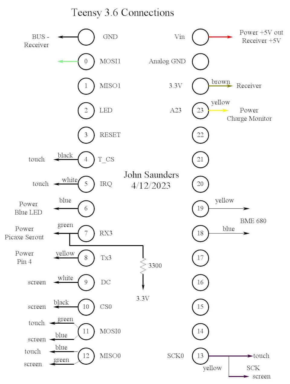 The Teensy and the receiver are always run from the battery and controlled by the Picaxe. The Teensy uses its own regulator to provide 3.3V for itself, the screen, and the BME680.