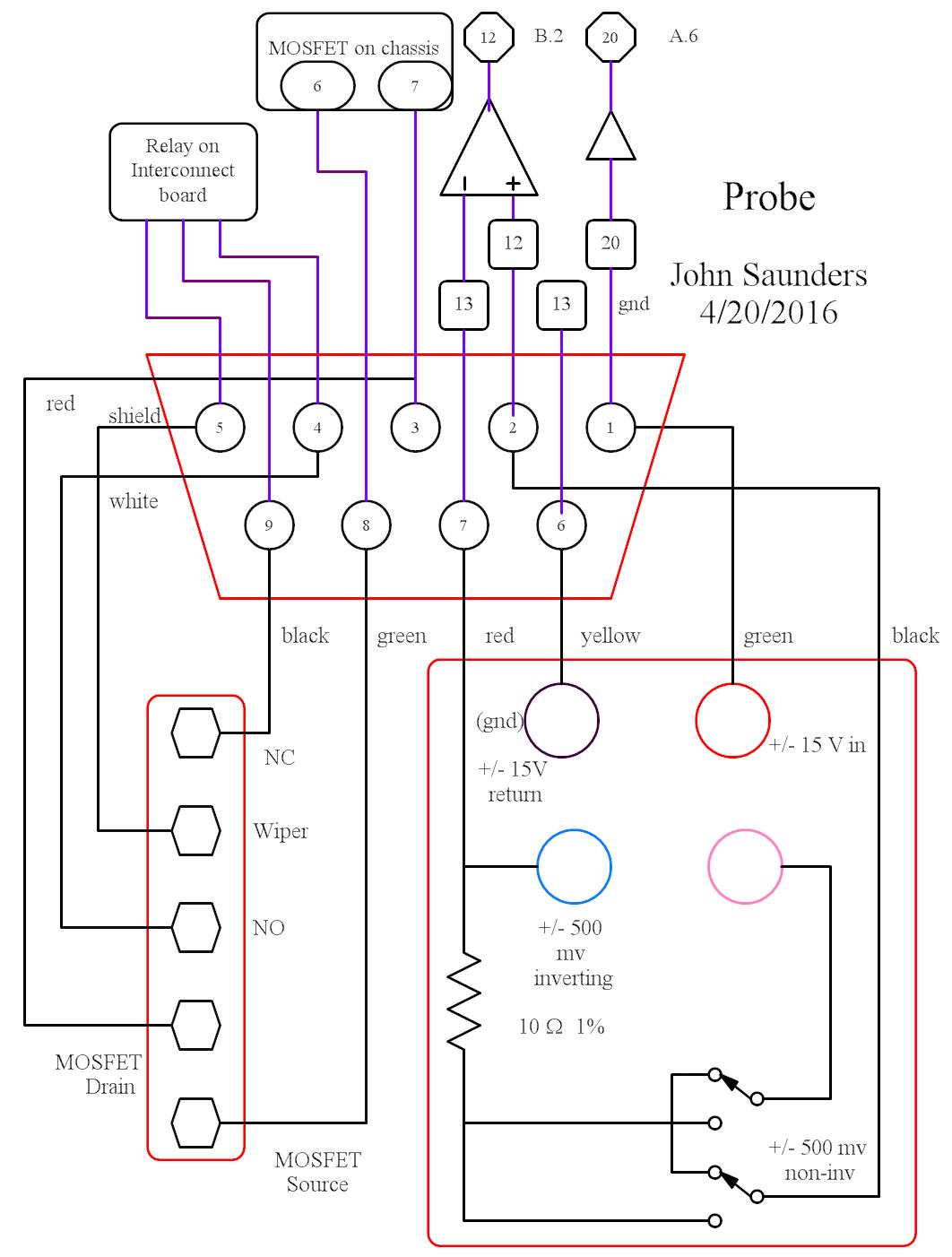 The Probe optionally plugs into the rear of the Controller to provide: 1. A voltage input of +/- 15V scale. 2. A semi-floating input of +/- 0.5V with a switched 10 ohm resistor in parallel. 3. A SPDT relay connection. 4. A semi-floating power MOSFET with its source and drain connections.