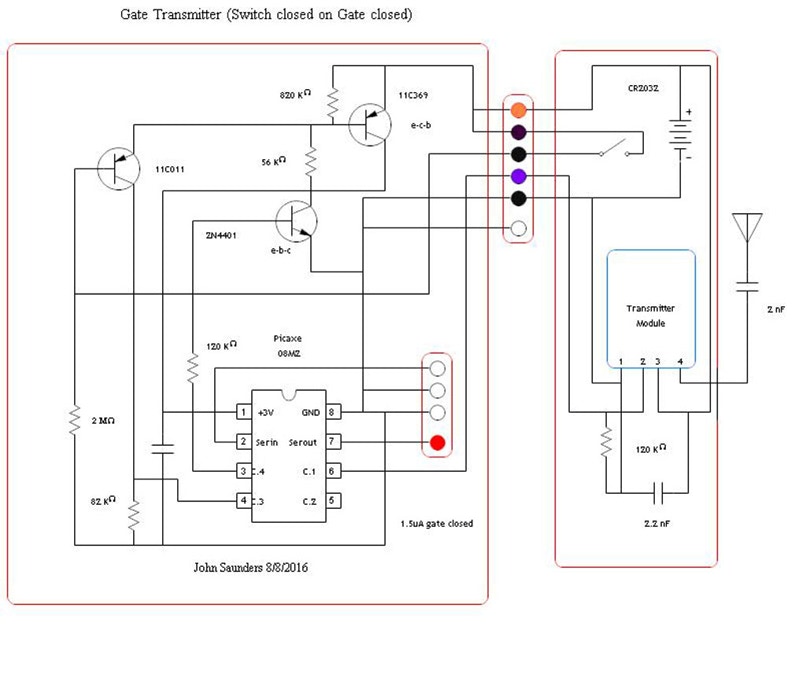 .The circuit uses a Picaxe 08M2 which is off if the gate is closed using 2 transistors for low current drain of 1 microamp. The NPN transistor provides more drive to support the transmitter.