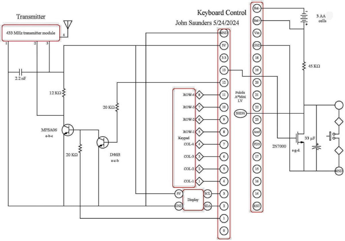 The Transmitter adapts to Arduino serial output via the circuit on the left. This is identical to that in the Bedside Clock, C.V. Only the 2.2nf capacitor is by the transmitter module.