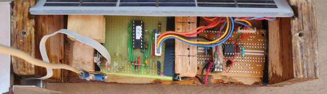 This is housed in a box for outside use. A 5-cell rechargeable battery is charged by a solar panel.
