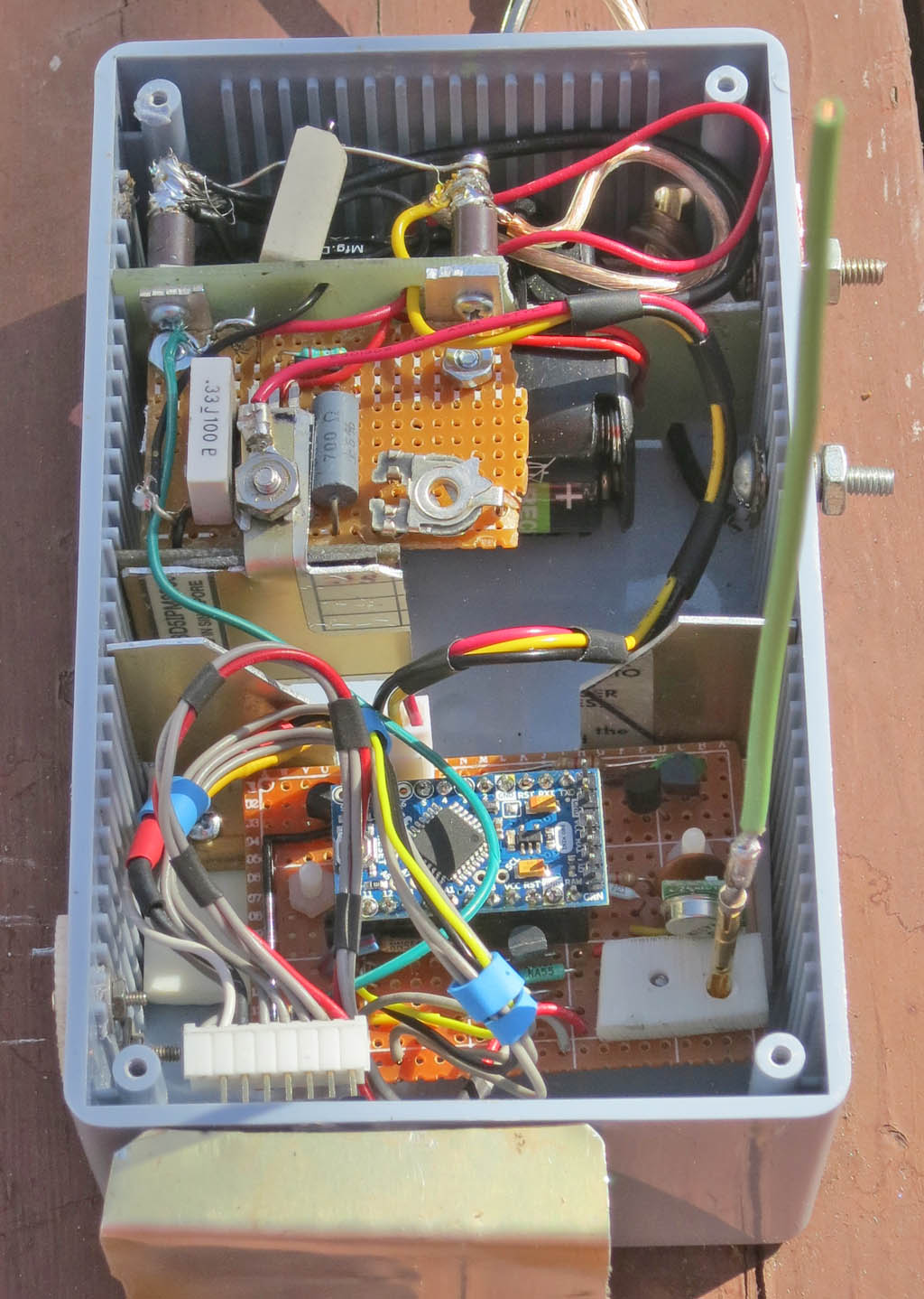 This is the inside from the top. It has three sectionns, At the top is the Shunt to measure the output of the solar panel. This includes charging current for a 12V battery connected to the studs at the right. It also contains half of the battery.