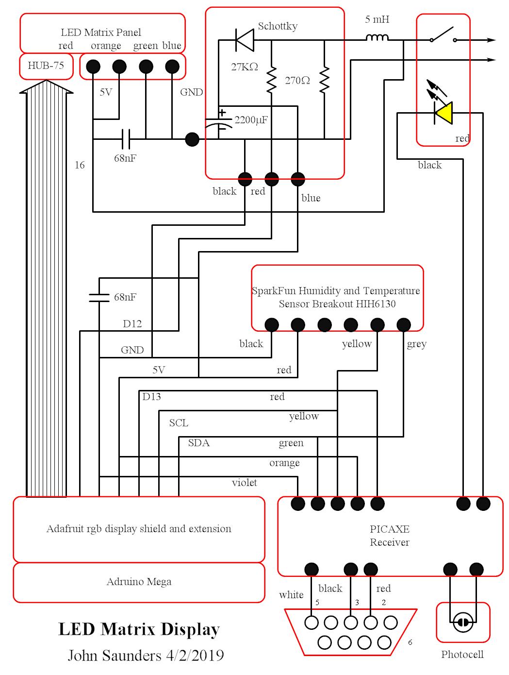 This project is based on one of those 3-color matrix modules which are used in masses for outdoor billboards. It has 64 columns and 32 rows and measures 80 x 169 mm. It has a 4-pin power and a 16-pin data connector. This latter is standardised with the name HUB-75. It contains circuits for latching and multiplexing, but still needs the processor to have a frame buffer. This buffer needs to store the 3 primary color values for each pixel. This implementation uses 4 bits per color, which are packed so that the frame buffer is 3072 bytes.This is too much for a Arduino UNO so a Mega, which has 8192 bytes, had to be used. This has enough that double-buffering was used, to eliminate update glitches. Since no HUB-75 shield is made for the Mega, I bought one for a UNO and glued an extension to it to pick up the 6 connections needed only for the Mega. Because Arduinos lack the sophisticated serial input instruction of Picaxe Basic, a second processor was made to provide for receiving data messages at 433 MHz from the Alpha LED Clock and the Solar Transmitter. It also receives paging commands from either the 12-position transmitter or the OLED Display. Other RF transmissions result in the display of notifications. Local temperature and humidity are provided by a digital sensor mounted behind the back panel. A light sensor controls display brightness. It is inside the cabinet but is illuminated by a light conduit at the side of the display. |